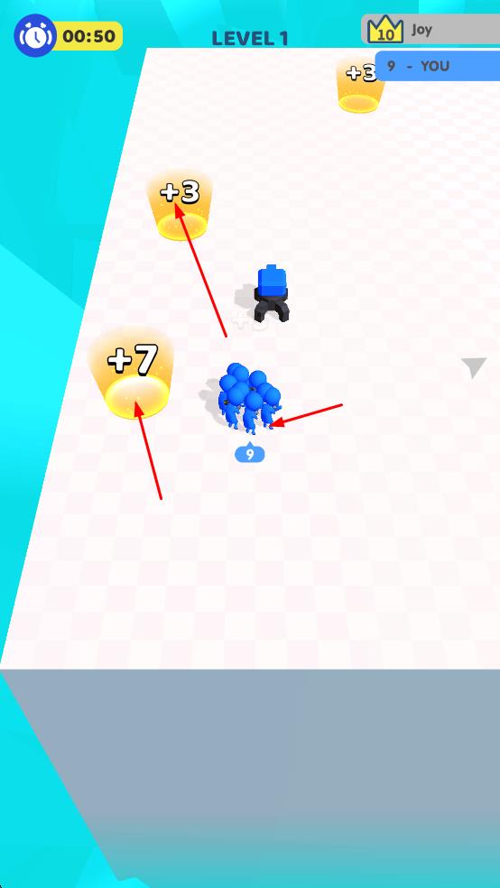 2、角色可以收集黄色的等道具,增加队伍的人数,同时注意上方的时间和队伍人数,为获得更高分数奠定基础。