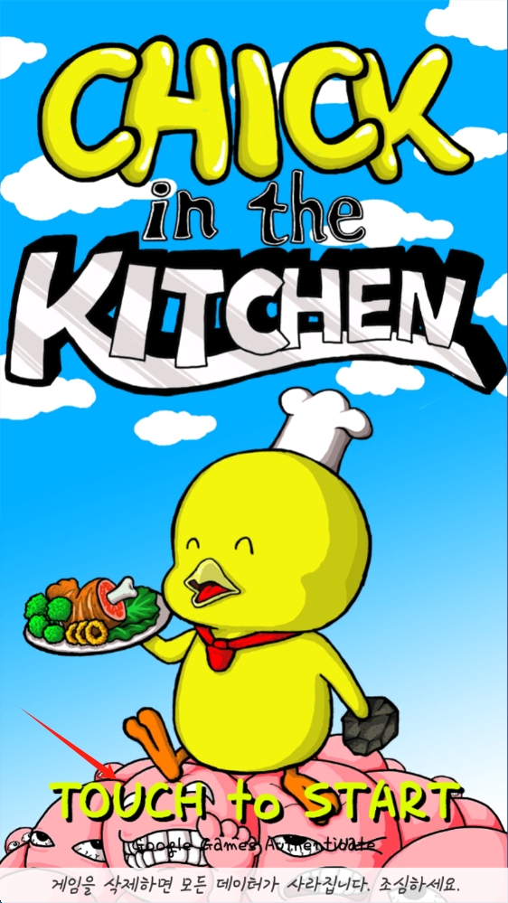 1、在Chick-in-the-Kitchen游戏启动界面,跟随箭头提示,点击TOUCHtoSTART,点击开始游戏。