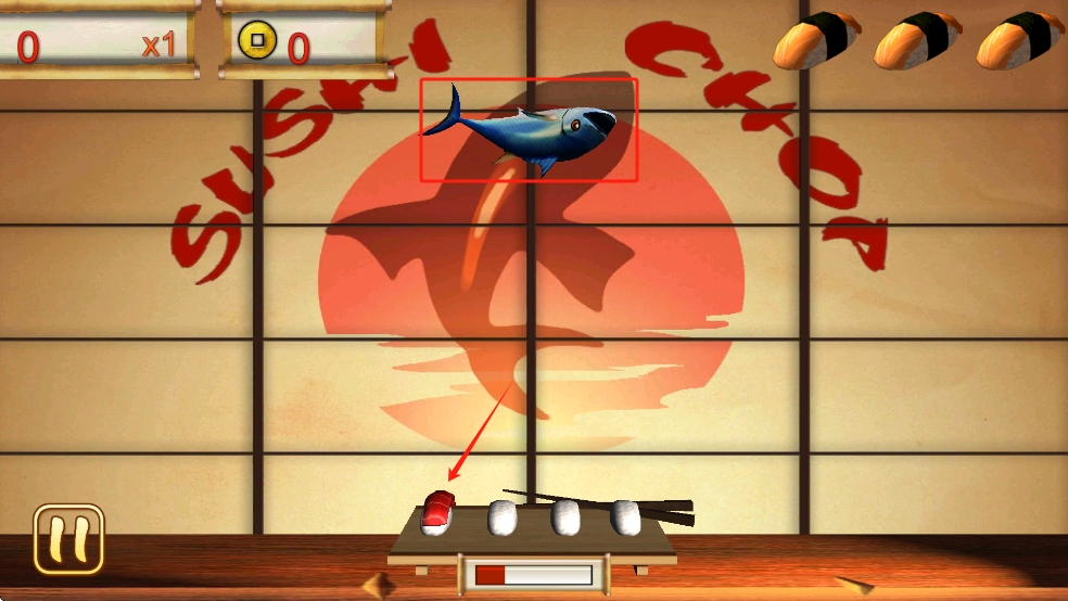 2、操作台突然弹出旋转的三文鱼寿司,紧接着金枪鱼寿司从两侧滑出,需快速滑动屏幕挥动刀具切割,注意避开夹杂其中的芥末炸弹。