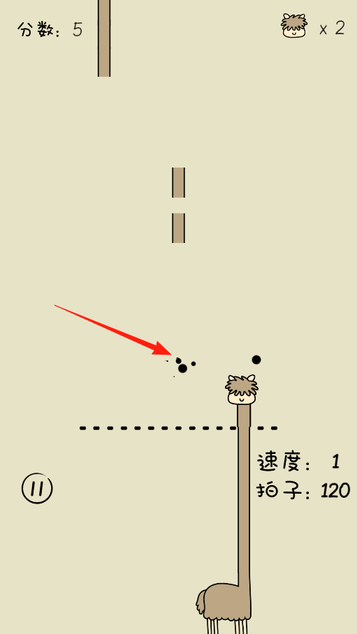 2、进入游戏场景,观察黑色小球下落,操控羊驼移动躲避小球,每成功躲避一次分数增加,注意保持移动,避免被小球击中,体验躲避挑战玩法。