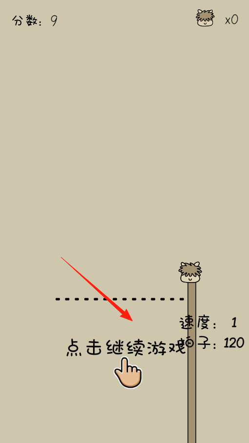 3、躲避小球后界面显示分数,点击点击继续游戏重新开始或进入下一轮挑战,通过此操作,延续游戏进程,尝试突破更高分数,体验关卡重置机制。