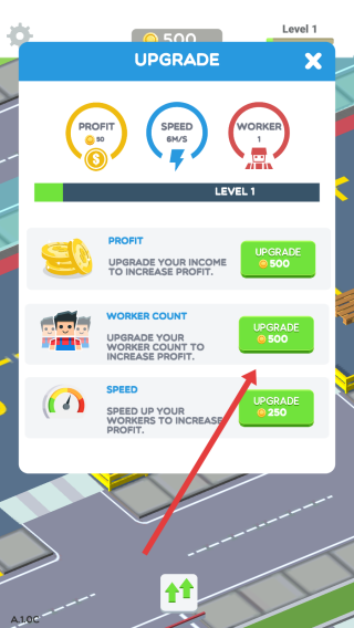 2、进入UPGRADE界面,选择WORKER-COUNT的UPGRADE按钮,花费500金币增加工人数量提升收益。