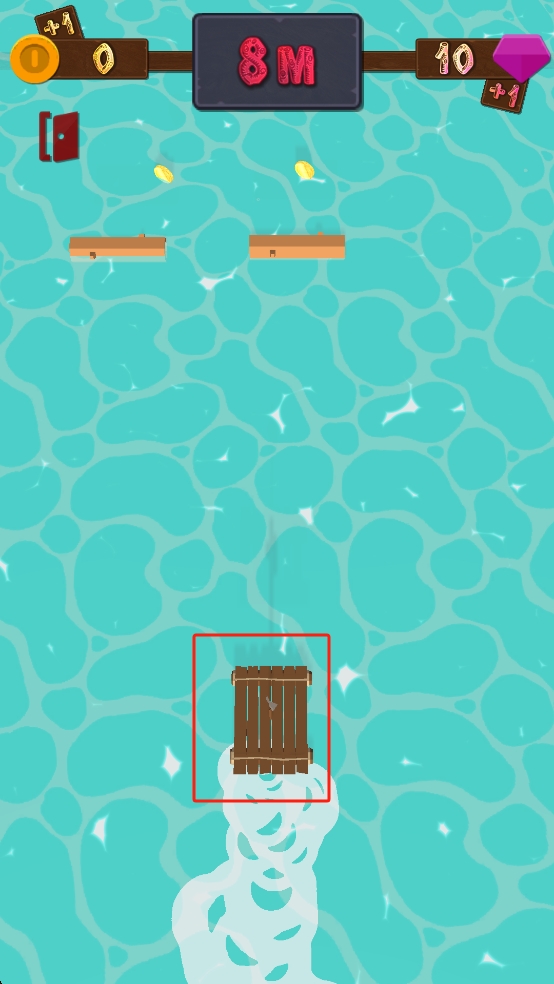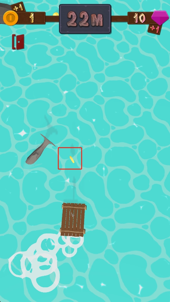 1、操控木筏在水面跳跃,看准上方金币位置,调整跳跃时机,避开鲨鱼,借助木筏弹性,提升行进距离。