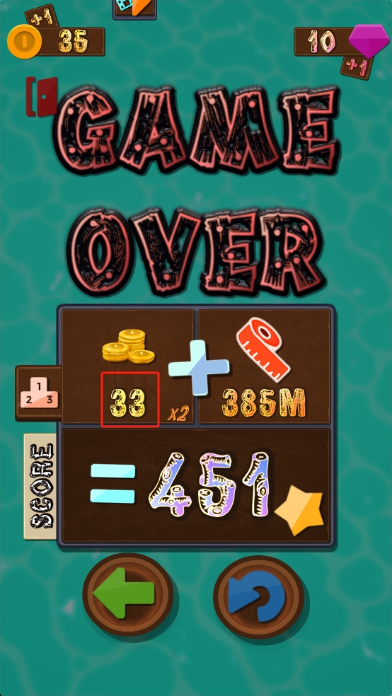 3、当游戏结束后,查看得分451及收获的33金币、385M距离,点击蓝色重玩按钮,即可重新挑战。