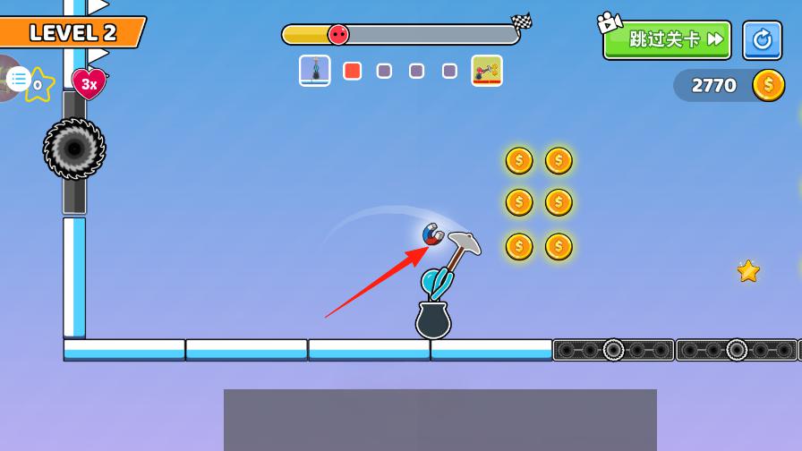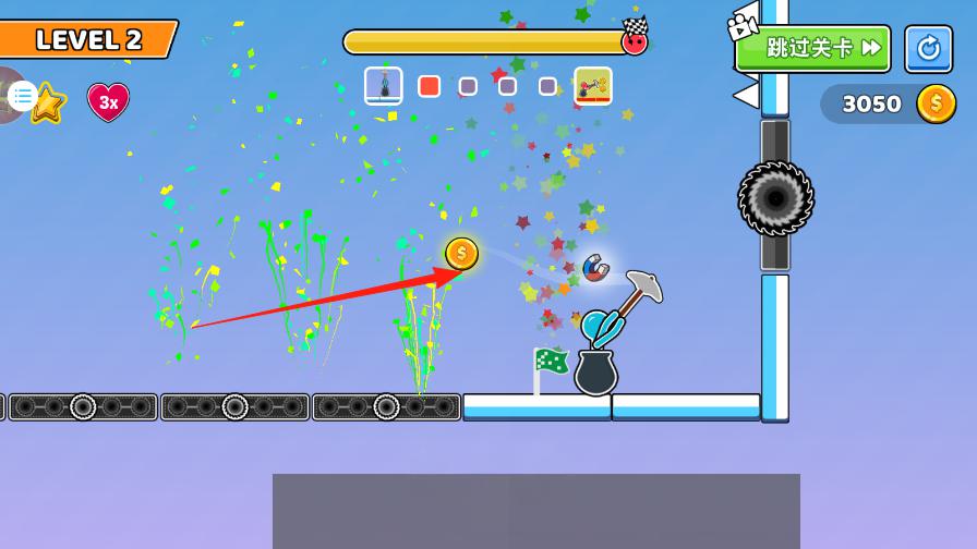 3、通过终点旗后,继续沿箭头方向,抓取空中金币,避开新齿轮,积累金币从2770→3050,完成LEVEL2挑战。