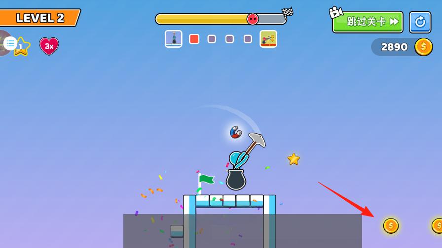 2、跳跃过坑,利用锤子弹力前进,收集星星和金币,推进关卡,注意上方进度条,保持移动节奏。