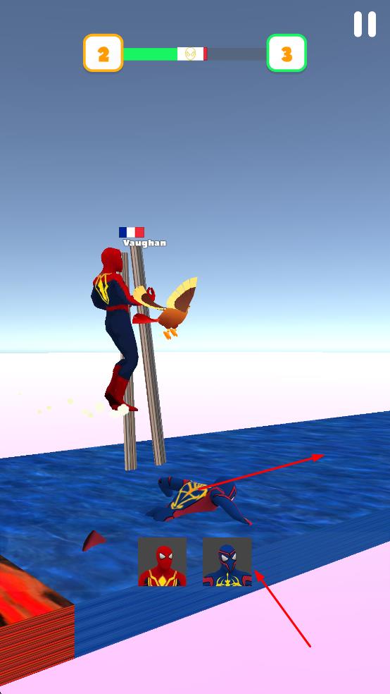 1、操控类似蜘蛛侠的超级英雄角色在不同场景中进行跑酷,角色可前后左右移动。