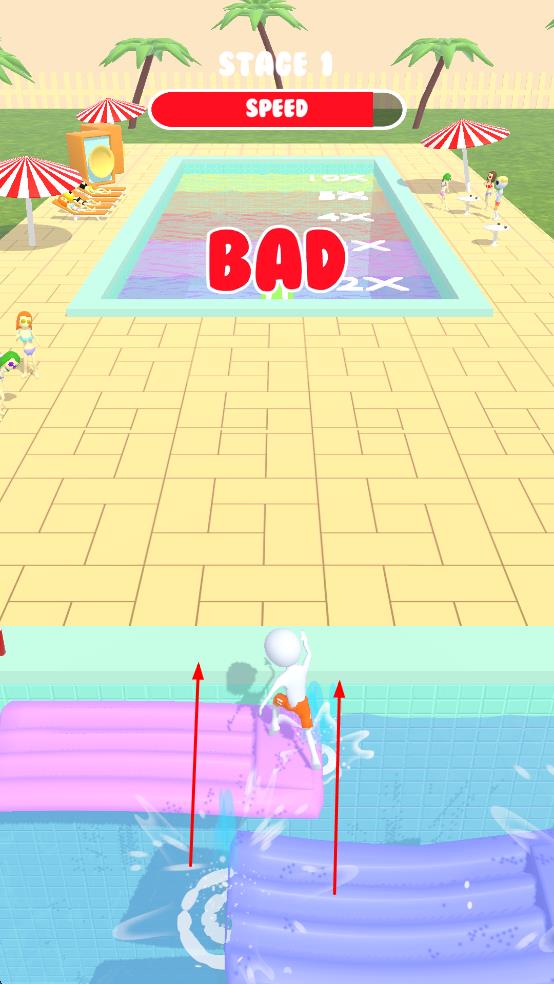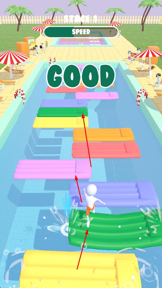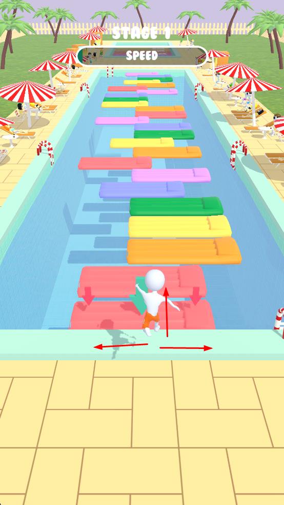 1、看到标有STAGE1的关卡标识,操控白色小人角色在泳池场景中进行跑酷,角色可前后左右移动,这是开启游戏的关键操作,顺利开启游戏之旅。