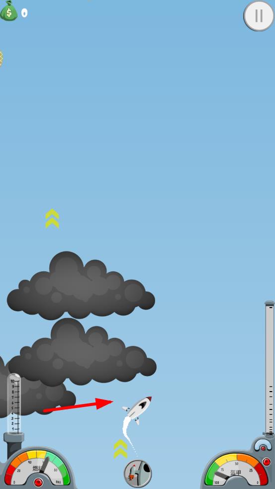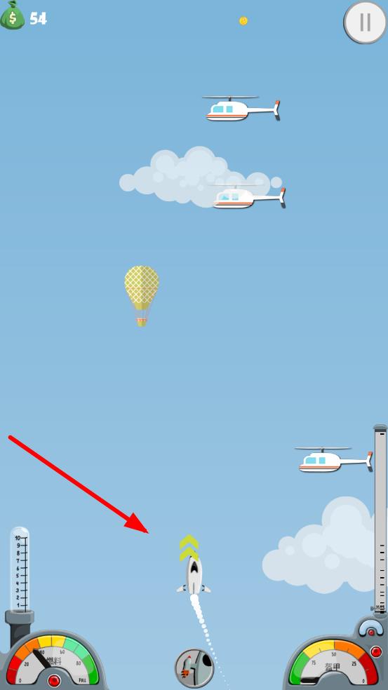 2、操控火箭躲避空中的气球、卫星等障碍物,适时使用加速功能提升高度,同时收集沿途的金币奖励。