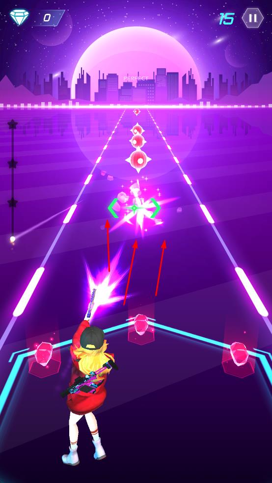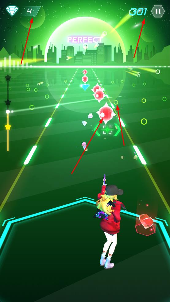 2、滑动射击命中音符:当带有音符的盒子从两侧靠近时,根据盒子的位置向左或向右滑动屏幕,触发射击动作命中盒子,需确保射击时机与音乐节拍同步。