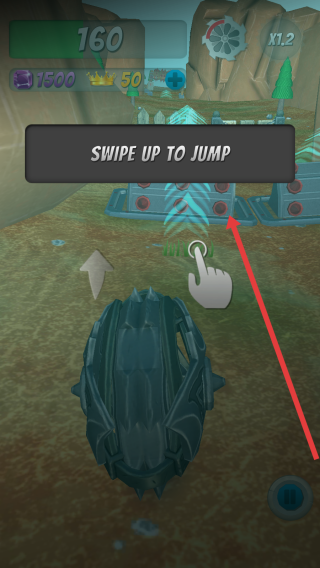 3、在关卡内,看到SWIPE-UP-TO-JUMP提示,向上滑动屏幕让车轮跳跃,越过障碍继续前进。
