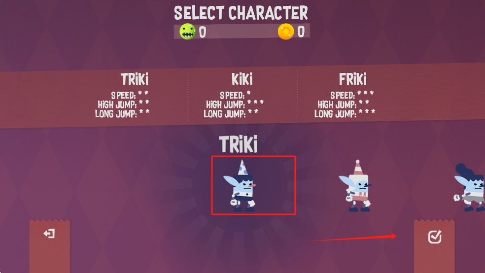 1、在角色选择界面,依据关卡需求选Triki,其速度、跳跃属性适配,点击右侧勾选按钮确认进入游戏。