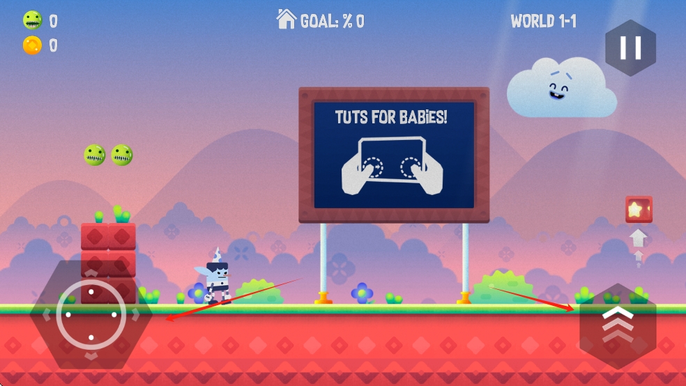 2、进入关卡1-1,用左侧摇杆控制移动,右侧按键跳跃,躲避绿色敌人,按场景推进,留意提示,顺利到达终点。