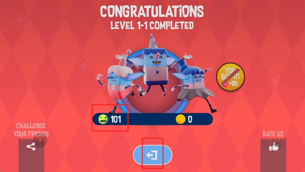 3、通关后界面显示击败101敌人等数据,点击中间蓝色箭头按钮,可返回选关或进入下一关继续挑战。