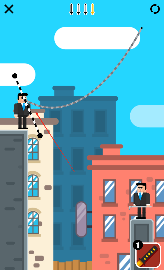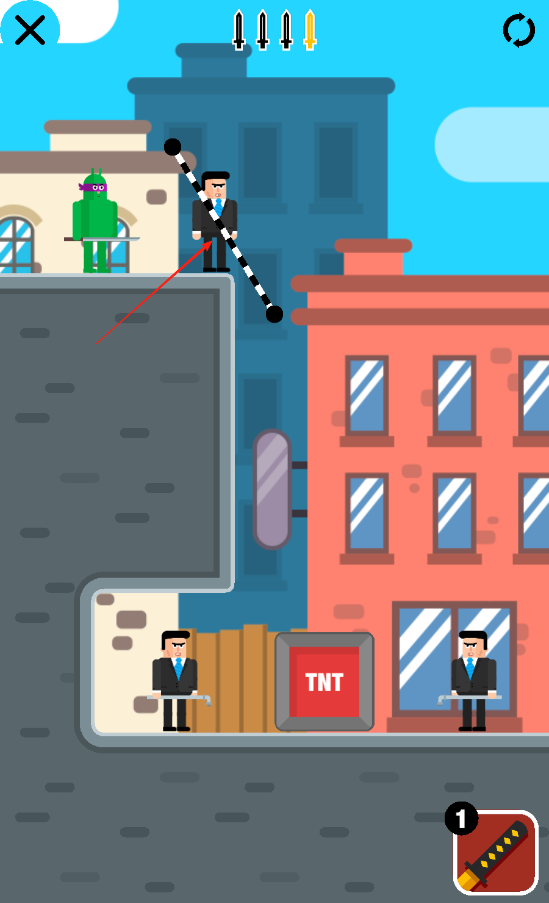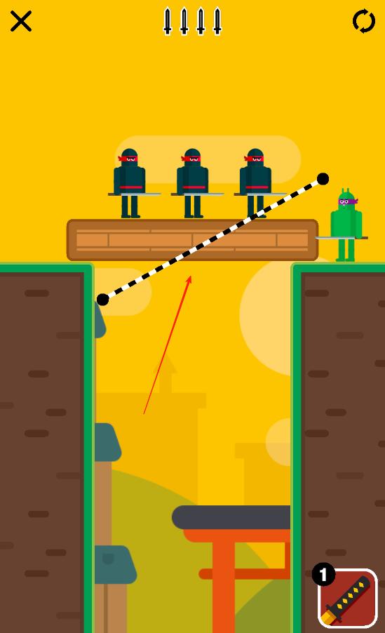 1、规划忍刀飞行轨迹:观察敌人位置与场景障碍,通过滑动屏幕确定忍刀飞行路径,利用墙壁等物体反弹,让刀精准击中目标,完成击杀任务。