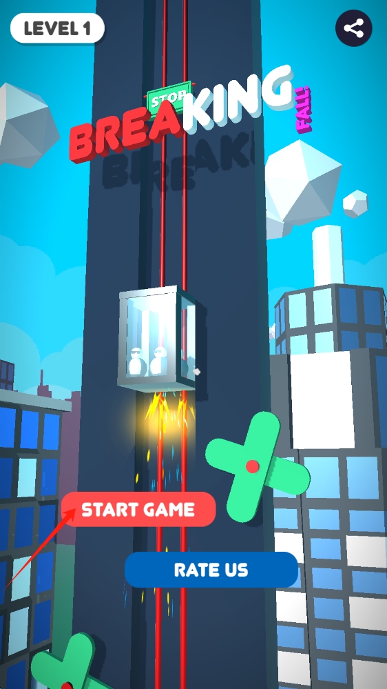 1、在Breaking-Fall游戏启动界面,跟随箭头提示,点击STARTGAME,开启Breaking-Fall冒险,点击开始游戏。