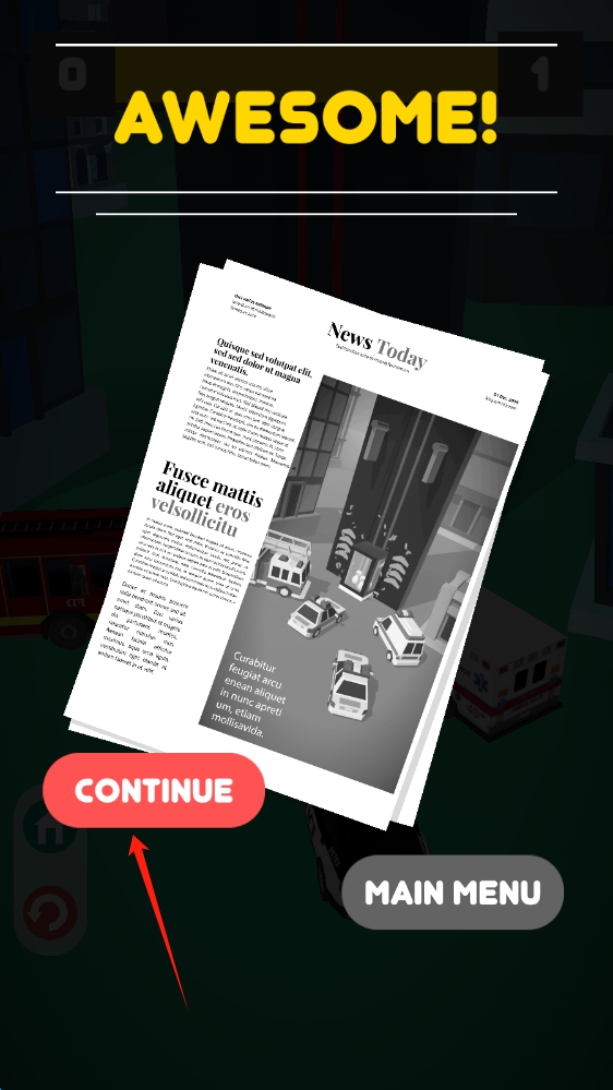 3、在游戏通关界面,根据箭头提示,点击CONTINUE,继续挑战下一关,探索更多游戏内容。