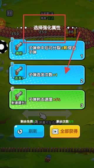 1、进入游戏界面,在红色方框内选择合适的强化属性,提升角色的能力,增强角色的战斗力。