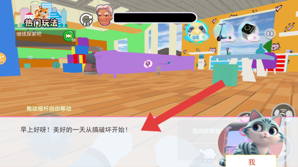 2、呈现室内环境,根据提示拖动摇杆自由移动进行操作,显示对话早上好呀!美好的一天从搞破坏开始!等内容。