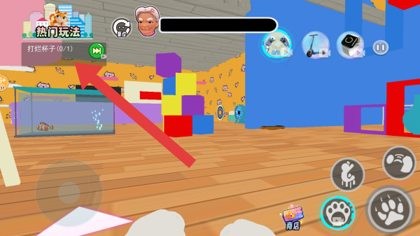 3、呈现室内场景,根据打烂杯子任务提示进行操作,操作摇杆、技能按键等元素,属于猫咪扮演搞破坏类型画面。