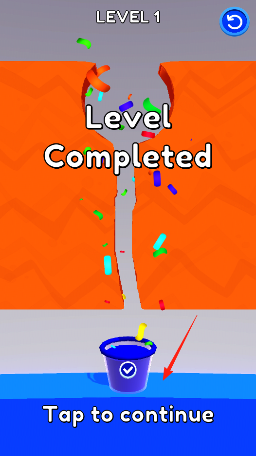 2、水流成功流入水桶,关卡完成,点击Tap to continue进入下一关卡,可查看奖励总结本关导流经验,体验关卡推进机制。