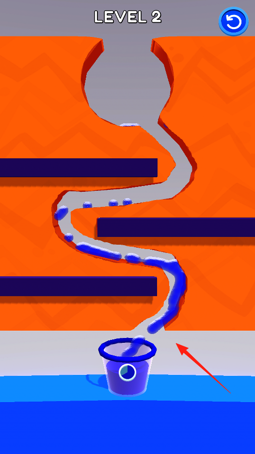 3、进入第二关,墙体有弯曲通道和障碍,需画线规划水流避开障碍,让水沿通道流入水桶考验画线精准度,体验复杂导流玩法。