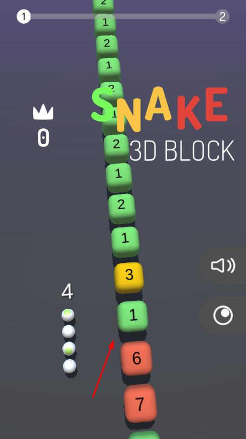 1、进入游戏,在初始界面中,可看到有一条贪吃蛇和带有数字的方块,通过点击屏幕,控制贪吃蛇的移动方向。