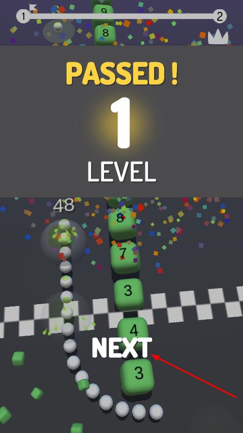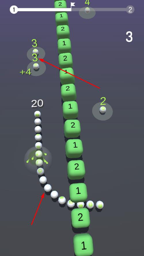 3、持续控制贪吃蛇前进,吃掉更多小球,避开阻碍,直至到达关卡终点。
