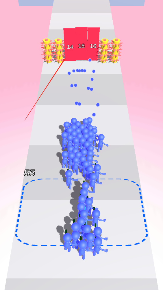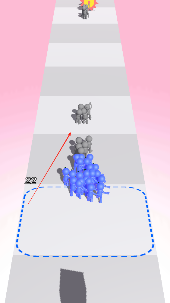 1、在虚线区域内画线,队伍则会随着我们画的线成一个阵型,向前走收集小人进入队伍。