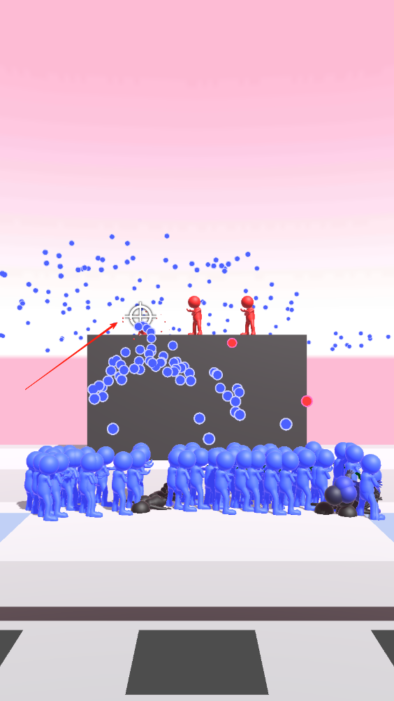 3、大队伍到达终点后,对面平台上站着攻击我们的红色小人,拖动准心,即可操纵蓝色小人射击对面的红色小人。