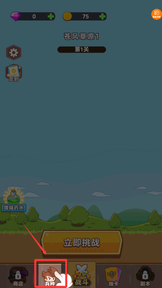 1、点击一下红色框框兵种按钮进入。