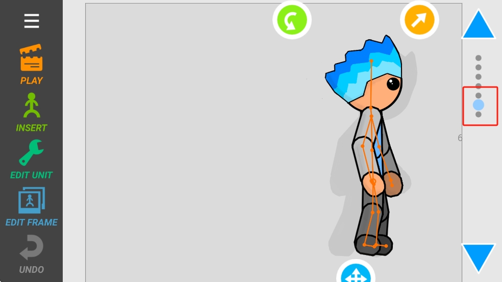 2、右侧点击蓝色圆点关键帧,记录当前火柴人姿势,移动时间轴,调整下一个关键帧动作,让角色从跳跃回到站立。