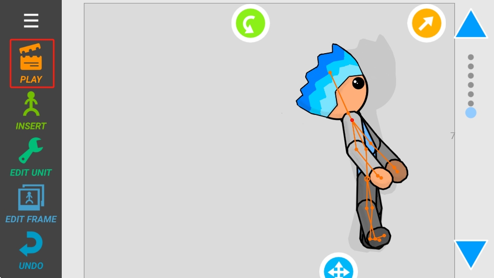 3、完成动作编辑后,点击左侧PLAY按钮,预览火柴人动画效果,检查动作连贯性,可返回编辑调整,制作连贯动画序列。