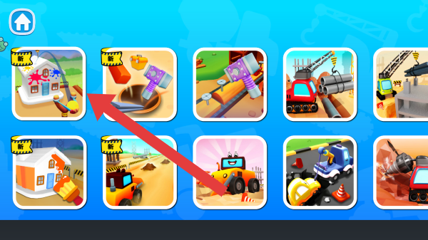 1、展示了多个关卡或玩法选项图标,图标内容包括房屋装饰、工具使用、工程车操作等场景。