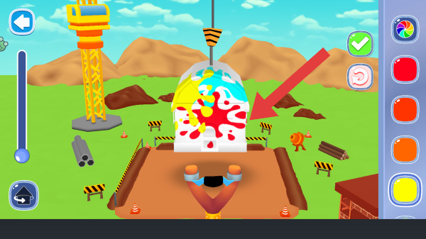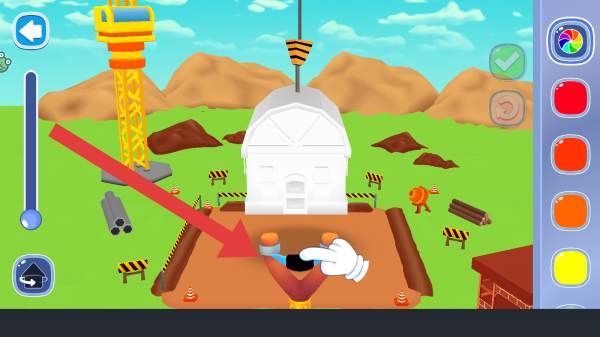 3、有塔吊、建筑、施工工具等、色彩涂装玩法右侧颜色栏、建筑上的彩色颜料,让玩家对建筑进行色彩创作的互动类儿童画面。