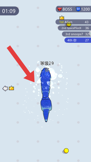 3、随着体型不断地变大,需要根据提示去攻击其余的玩家并进行吃掉,逐渐壮大自己的体型。