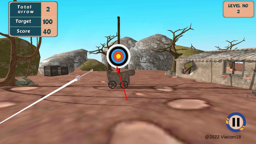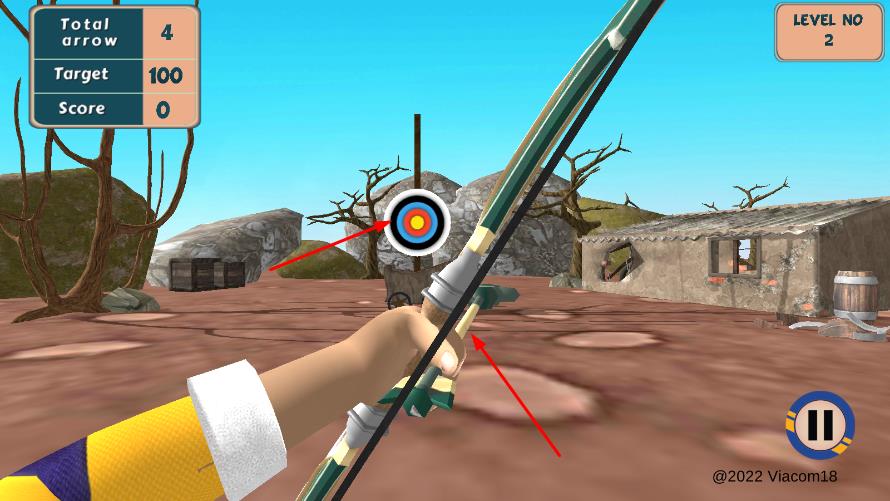 2、看到前方有指定的目标物品,通过滑动屏幕等操作,控制弓箭的瞄准方向,调整好角度和力度后,点击屏幕发射射出弓箭。