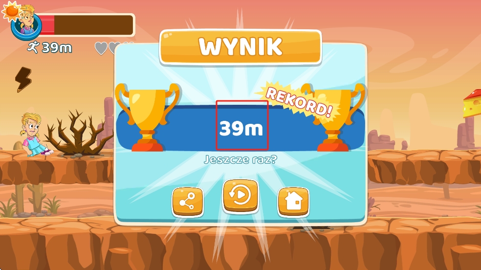 3、角色失败后界面显示成绩39米,点击中间的重玩按钮可重新挑战,分享点左侧按钮,回主页则是点右侧的房子图标。