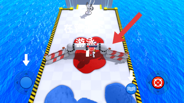 3、画面中角色在水上的跑道上,跑道有障碍物,左下角是移动控制按钮,右下角分别是设置和游泳相关功能按钮。