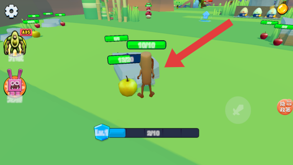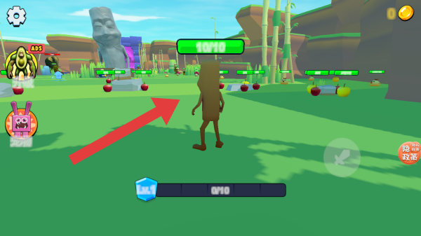 1、玩家处于有水果、雕像等元素的户外场景,从风格和元素看是卡通3D冒险战斗类,画面含角色、场景、数值。