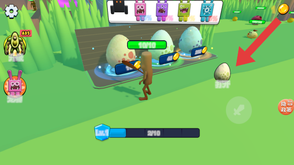 3、上方展示多种卡通形象,下方有孵化蛋的装置,点击打开,是冒险养成类的玩法。