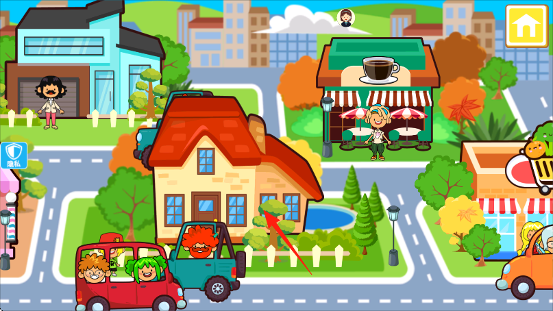 1、在城镇场景,按箭头进入红顶房屋,探索家庭互动,与角色对话、触发剧情。