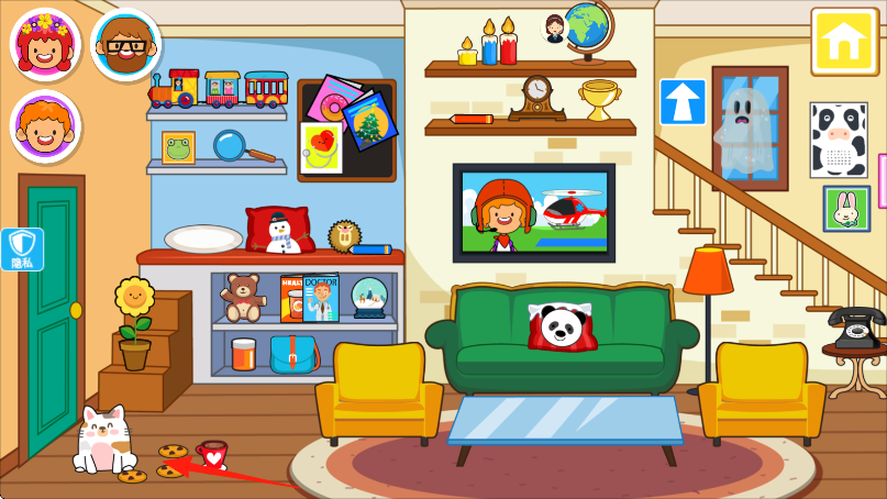 2、客厅场景,点击地上饼干、杯子,与猫咪互动,收集物品,查看书架、电视,解锁隐藏内容。