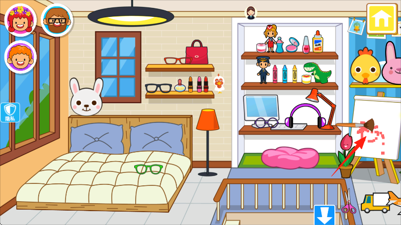3、卧室场景,按箭头指引,在画板涂鸦,搭配眼镜、包包,自定义角色装扮,完成创意玩法,推进游戏体验。
