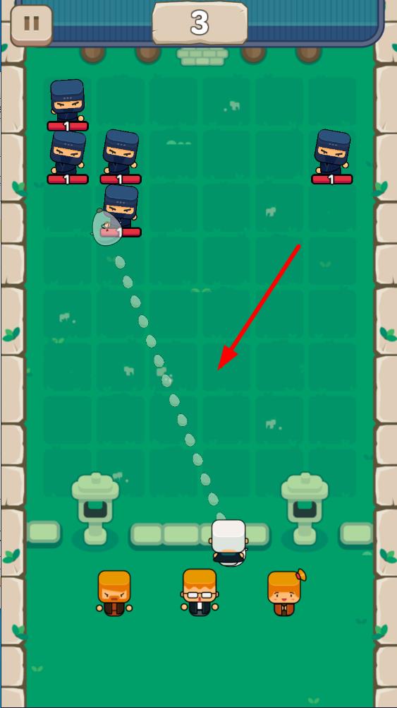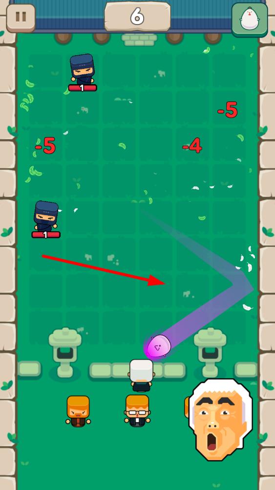 2、按住屏幕移动调整发射角度和力度,松开手指发射小鸡,利用反弹击中更多忍者,积累分数。