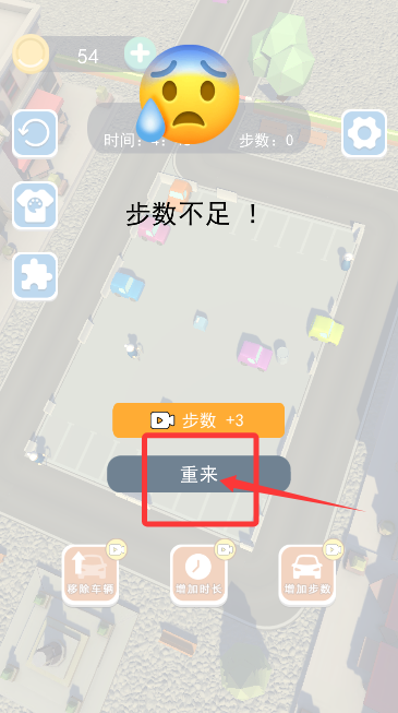 4、挑战失败时点击重新开始,优化移动方案,最终帮助目标车辆成功驶离。