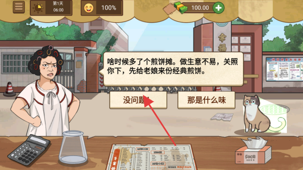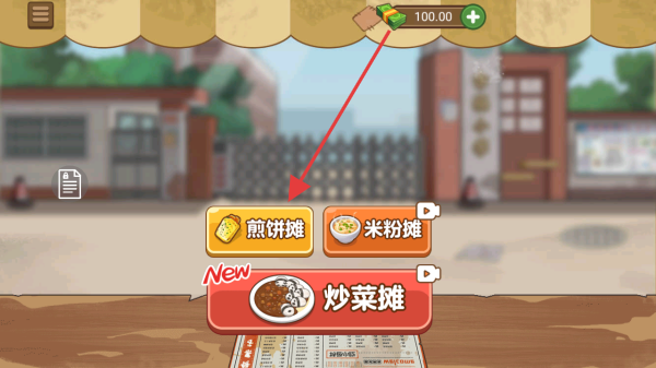 1、进入游戏界面,根据红色箭头所指的方向,选择煎饼摊选项,开始进行煎饼制作任务,推进游戏的剧情发展。
