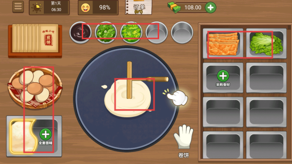 3、利用红色方框内的虚拟按钮选择食材,制作煎饼,完成顾客的订单,获取游戏得分和奖励,积累游戏资源,提升角色的能力。