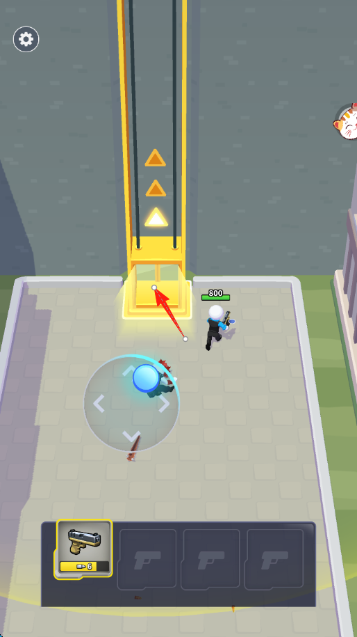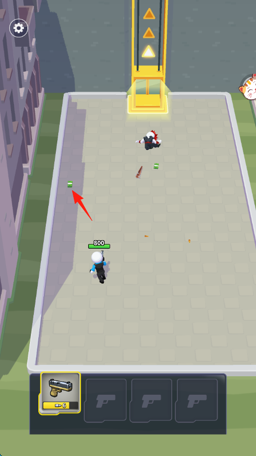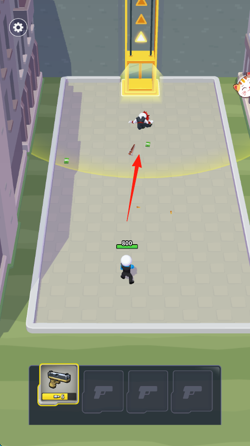 1、操控持枪角色血量800,按箭头指引,移动拾取场景道具武器、金币,靠近敌人红发角色。