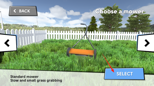 2、进入割草机选择界面,查看不同割草机属性。点击SELECT选定标准割草机,用其进行草坪修剪,感受不同工具的割草效果,体验工具选择机制。